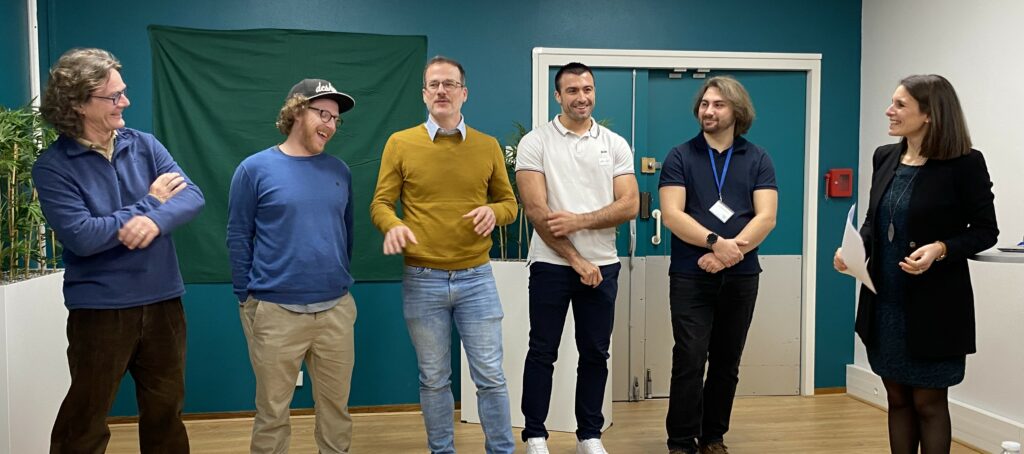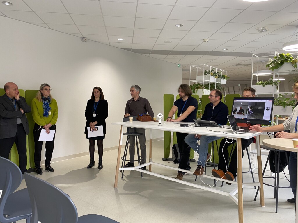 Les référentes innovation n’étaient pas les seules personnes à se présenter à nos invités. Ces derniers ont également fait la connaissance et la découverte de l’équipe de développement de projets d’innovation digitale, (La Fusée). Cette équipe est composée de ses deux project managers, Laurent Licari et Marie Murcia, d’un product owner Antoine Leclerc et de quatre développeurs Nolan Cano, Brice Girard, Alexandre Merlette et Julien Rey.